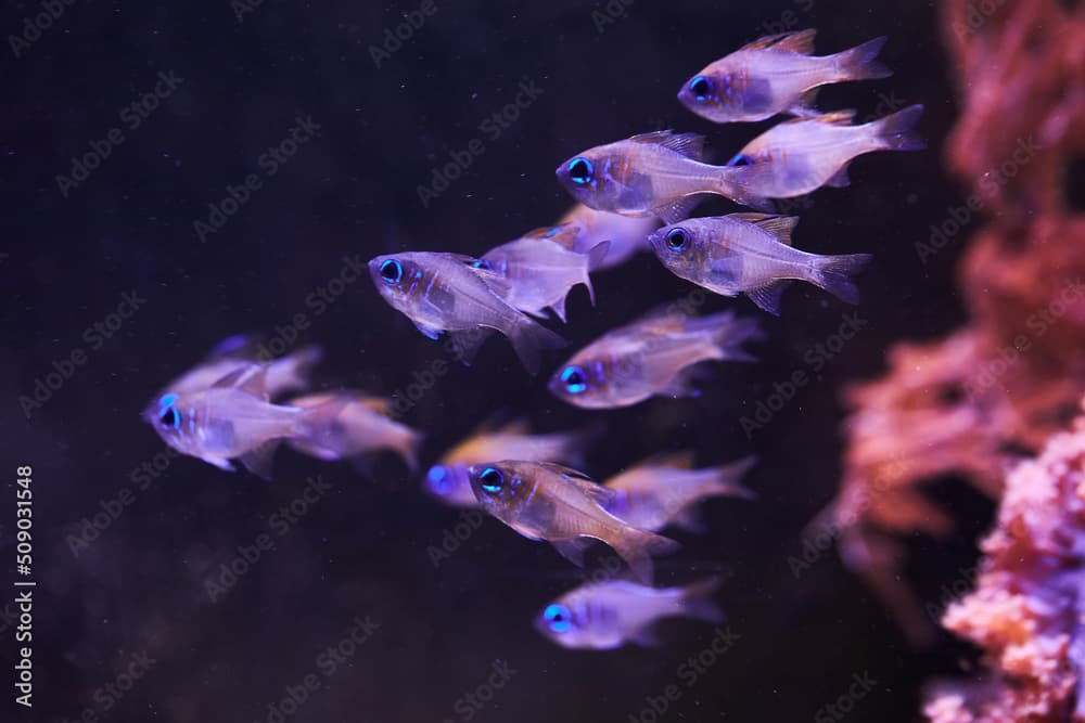 Threadfin Cardinalfish are relatively easy to care for, making them suitable for both novice and experienced aquarists. They thrive in a well-established aquarium with plenty of hiding spaces and a peaceful environment. They are nocturnal by nature and prefer dimly lit tanks. A varied diet of small meaty foods such as mysis shrimp, brine shrimp, and finely chopped seafood will help maintain their health and coloration.