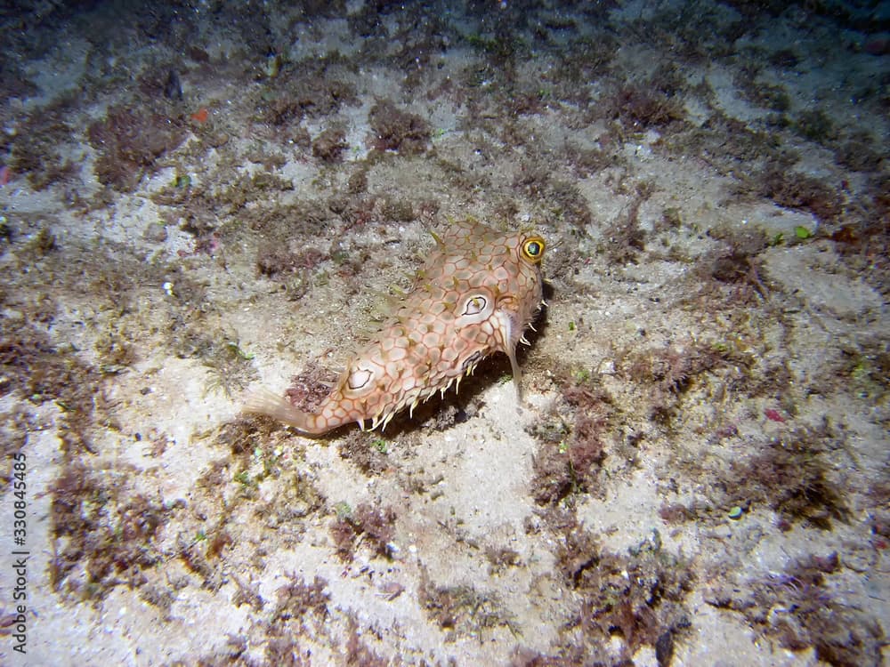 The Burrfish, scientifically known as Chilomycterus antillarum, is a distinctive species of boxfish known for its unique appearance. It has a globular body covered with spines that can be erected when the fish feels threatened, giving it a burr-like appearance. This defense mechanism, along with its ability to secrete toxins from its skin, deters predators and makes it a fascinating addition to the aquarium.