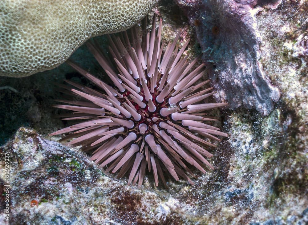 The Rock Boring Urchin, scientifically known as Echinometra lucunter, is a species of sea urchin commonly found in the tropical Western Atlantic, including the Caribbean Sea and the Gulf of Mexico. This species is known for its ability to bore into solid rock, creating shelter and living space. It has a dark, often reddish-brown to greenish-black test (shell) with short, sharp spines that can vary in color from red to purple, brown, or green.
