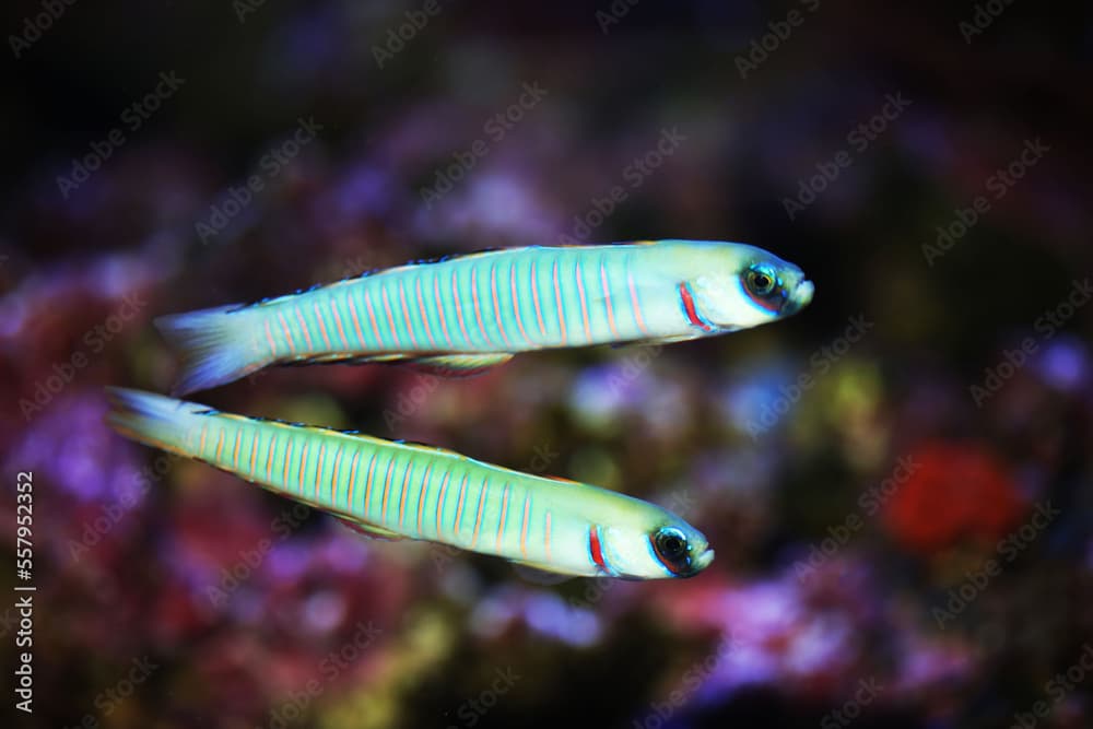 The Zebra Dartfish, scientifically known as Eviota zebrina, is a small and captivating species of goby that is cherished by aquarists for its striking zebra-like pattern and dynamic behavior. This species is part of the diverse Gobiidae family, which is known for its vast array of colorful and interesting members. The Zebra Dartfish is particularly noted for its slender body, adorned with alternating horizontal stripes of dark and light colors, which provide excellent camouflage among the coral reefs it inhabits.