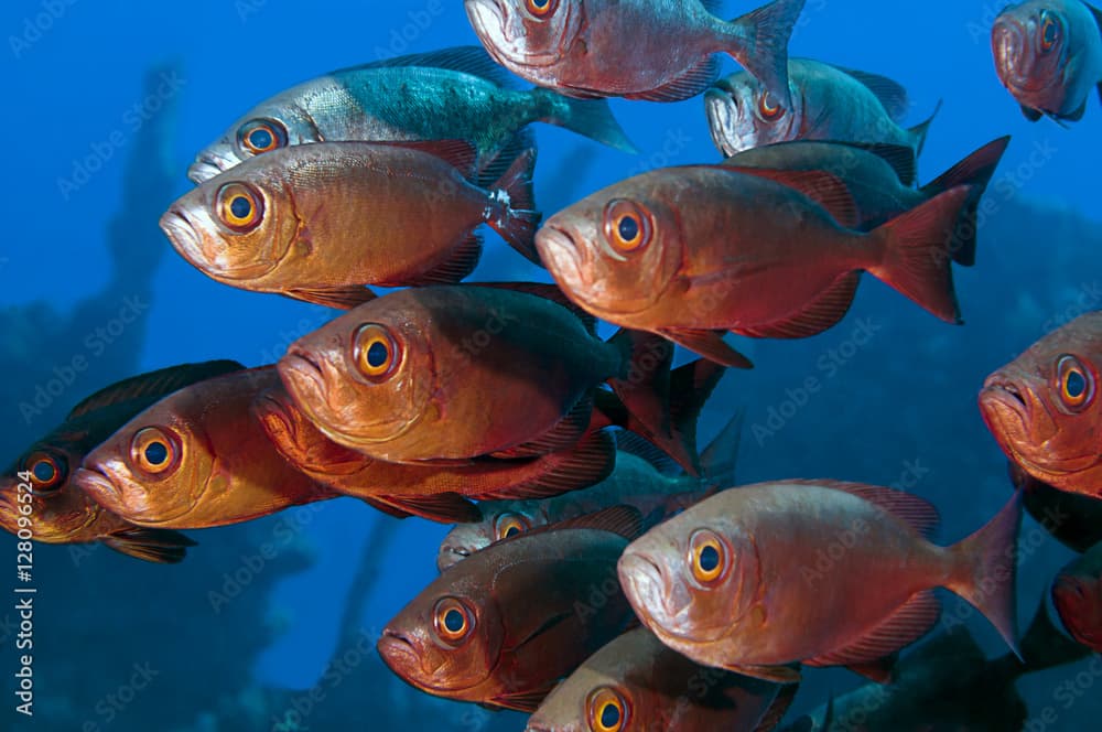 Priacanthus, commonly known as Bigeyes or Catalufas, are a genus of marine fish known for their large, prominent eyes and nocturnal habits. They are found in tropical and subtropical oceans worldwide, often inhabiting caves or ledges during the day. In the aquarium, they require ample hiding places and a dimly lit environment to mimic their natural habitat. These carnivorous fish feed on a variety of meaty foods and can grow quite large, making them suitable for spacious tanks. Their unique appearance and behavior make them an interesting addition to a fish-only or large reef aquarium.
